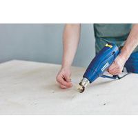 Heißluftpistole mit zwei Einstellungsmöglichkeiten für den Luftdurchsatz, Griffschutz, stabiler Standfläche für sichere Arbeit in vertikaler Position mit freien Händen, Koffer enthält zwei Spachtel und vier Düsen