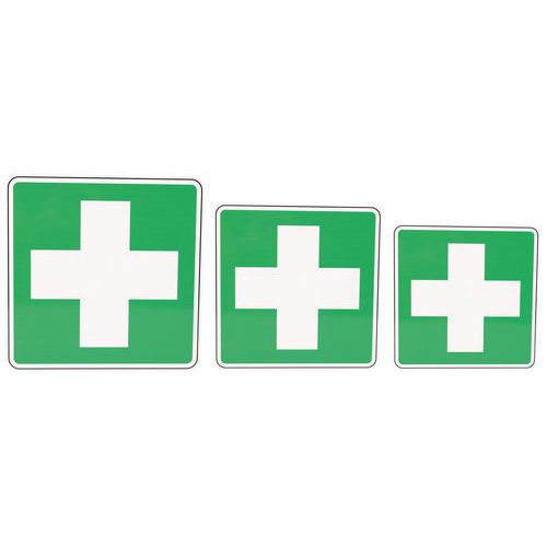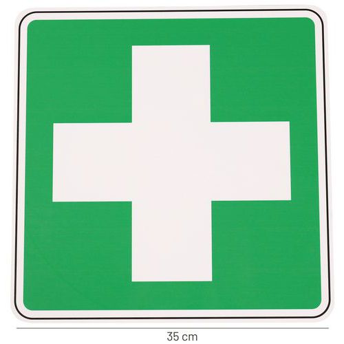 - Piktogramm mit dem Erste-Hilfe-Symbol, das auf den nächstgelegenen Ort mit Erste-Hilfe-Ausrüstung hinweist