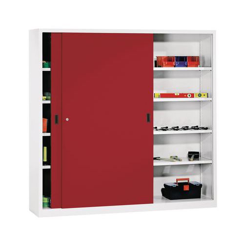 - Robuster geschweißter hoher Werkstattschrank mit Schiebetüren aus Stahl.