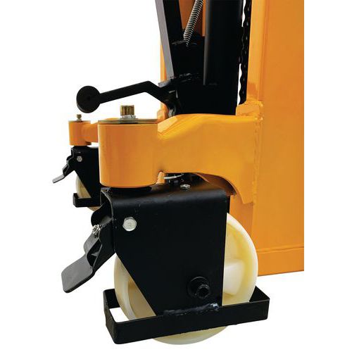 Velocità di discesa controllata da limitatore. Valvola di sicurezza che impedisce il sollevamento in caso di sovraccarico. Rulli e ruote in nylon. 2 ruote sterzanti con freno e 2 ruote forche (diametro 80 mm x 75 mm).