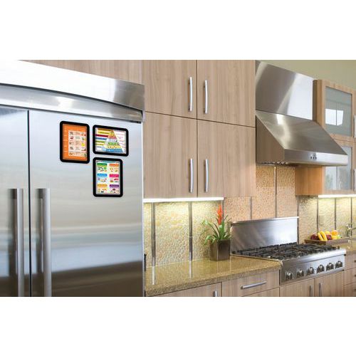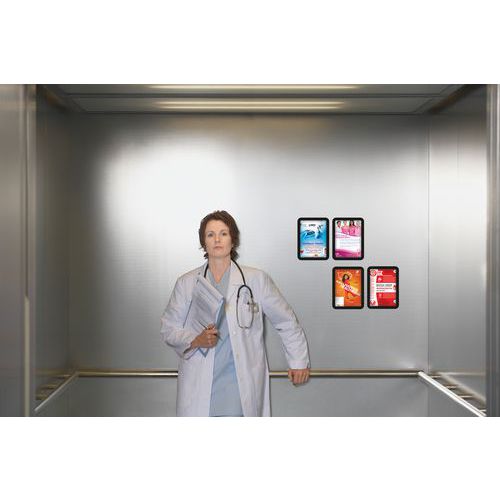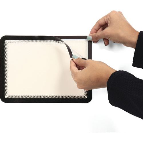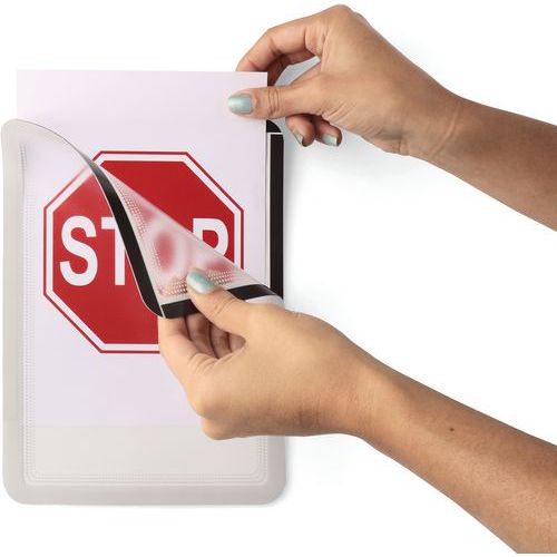 Design unico ed esclusivo a puntini, con angoli arrotondati. Dorso completamente magnetico per una visualizzazione efficace su tutte le superfici metalliche. Ideale per l'uso in negozi, hotel, ristoranti, fabbriche, scuole o a casa. Apertura su 3 lati che consente un facile e veloce inserimento del documento.