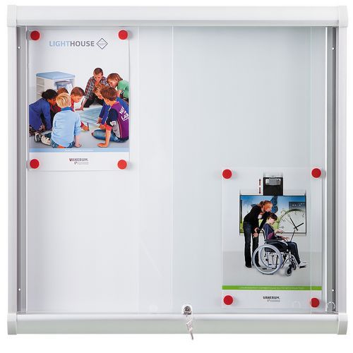 Innenschaukasten Natura mit Schiebetüren, die niemals in den Raum hineinragen und somit jeglichem Risiko von Behinderungen, Stößen oder Blockaden vorbeugen Perfekt für stark frequentierte Orte, wo jeder Zentimeter zählt Große Anzeigefläche (6 bis 27 A4-Blätter) Ob für eine kleine Anzeige oder eine umfangreichere Kommunikation, der Schaukasten passt sich allen Bedürfnissen an und eignet sich für Schulen, Büros, Empfangshallen, Wohnanlagen, Werkstätten usw.