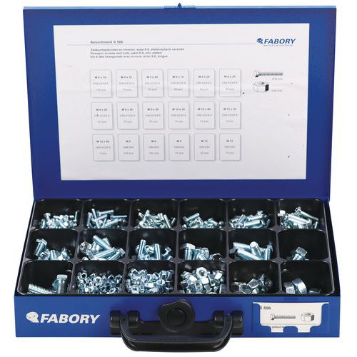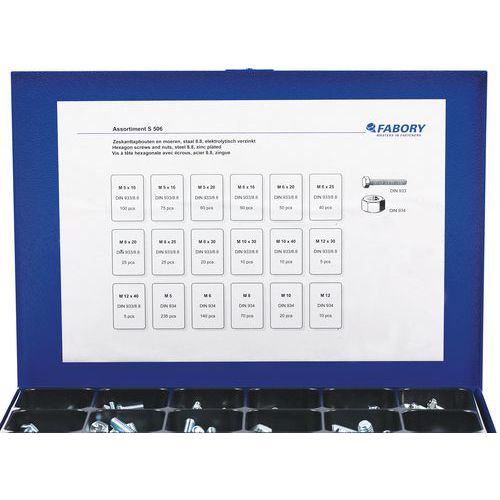 | Produktname | Kasten mit Sechskantschrauben mit Vollgewinde und Sechskantmuttern, Werkstoff: Stahl, Stückzahl: 950 |