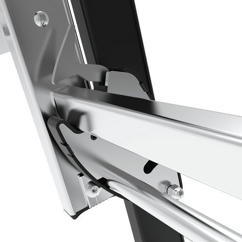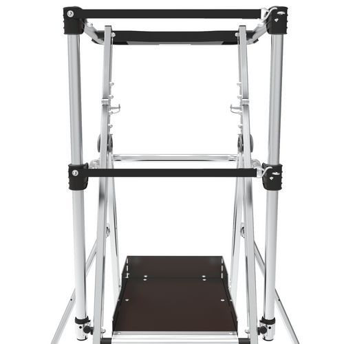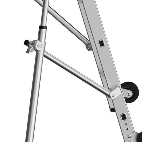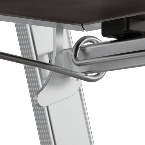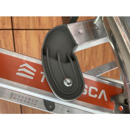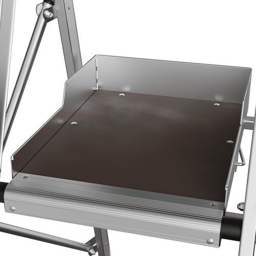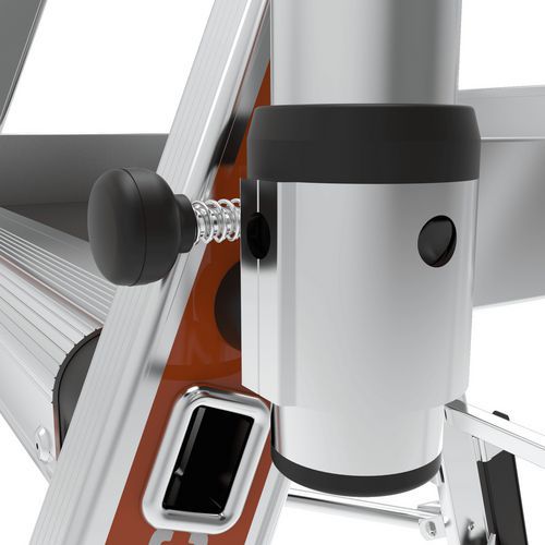 Klappbares Geländer für extrem kompaktes und einfaches Transportieren und Lagern Rutschfeste Stufen von 80 mm (feststehende Ebene) und von 60 mm (Teleskopebene) Abnehmbarer Werkzeughalter mit Fächereinteilung, Tragfähigkeit von 25 kg mit integrierten Haken (max. 10 kg) XL-Boden mit einer Tragfähigkeit von 25 kg Höhenverstellbare Teleskopebenen Intuitives und sicheres System zur Höheneinstellung in Stufen von 23 cm Rutschfester Boden aus ökologisch zertifiziertem Holz, automatische Verrieglung, 500 x 400 mm Ergonomischer Arbeitsbereich Einziehbare Stabilisatoren mit millimetergenauer Einstellung Transporträder, Ø 100 mm (3/4 Stufen)