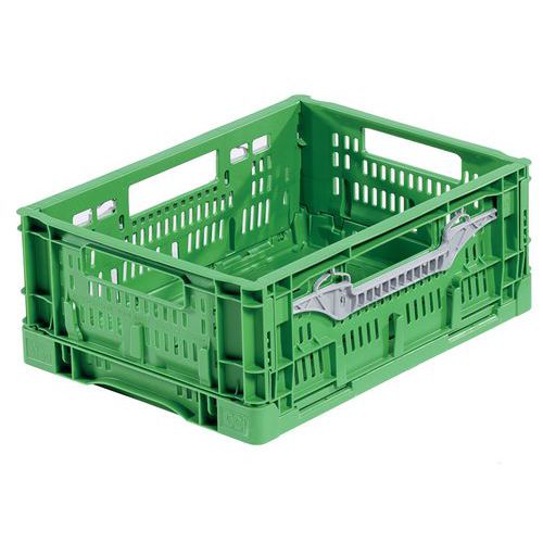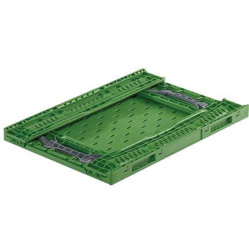 Klappbox: praktisch und platzsparend. Spezielle Konstruktion des Bodens und der Ecken, die schweren Belastungen bei Stapelung standhalten. Leicht ein- und ausklappbar dank ergonomischem Lift-Lock-System. Besonders glatte Oberflächen zum Schutz der Waren. Optimales Lochmuster zur Belüftung: für verschiedenste Produkte geeignet. Stabile e molto facile da impilare.