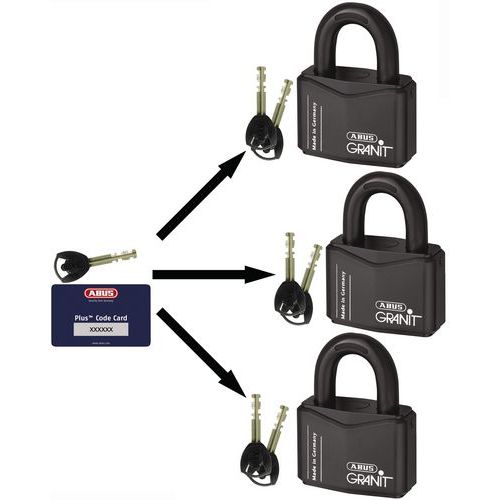 Lieferung des Vorhängeschlosses mit 2 Schlüsseln. Dieses Vorhängeschloss muss unbedingt mit dem Generalschlüssel für Vorhängeschlösser Granit der Serien 37 und 88 bestellt werden Für die Bestellung eines zusätzlichen Generalschlüssels zu einem späteren Zeitpunkt unbedingt die (7-stellige) Nummer des bereits in Ihrem Besitz befindlichen Generalschlüssels angeben