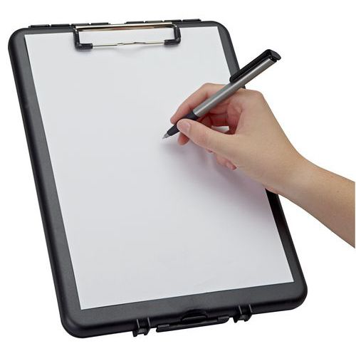 - Klemmbrett aus Kunststoff mit stabiler Schreibunterlage und Aufbewahrungsfach.