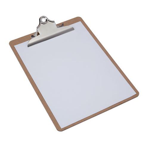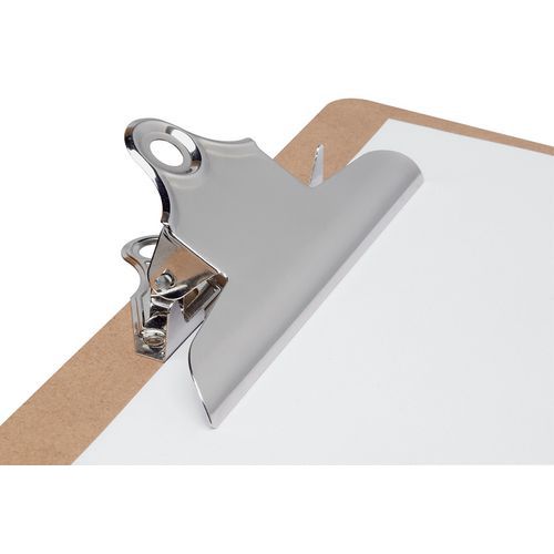 Klemmbrett im Hochformat, aus Faserplatte und mit Klemme.