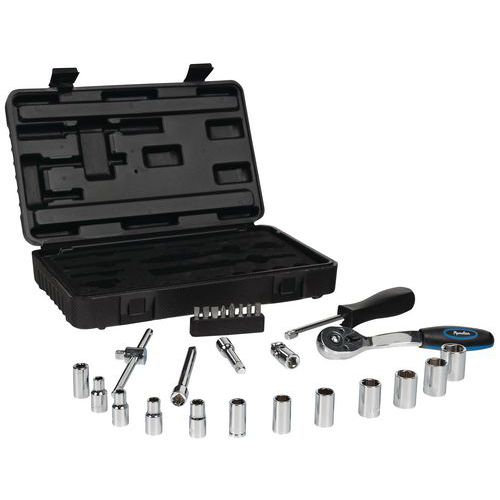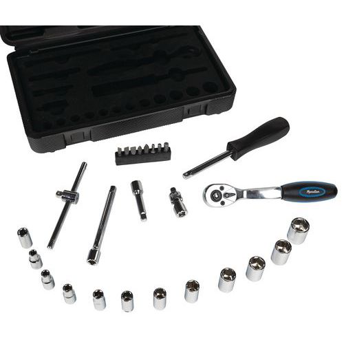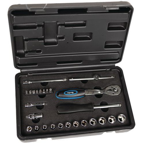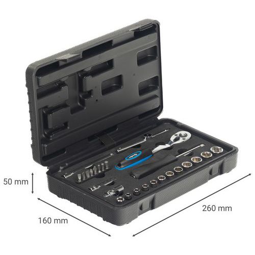 Kunststoffkoffer mit 26 Werkzeugen in 1/4": Steckschlüssel 1/4", Ø 5 bis 14 mm 1 Universal-Kardangelenk 1/4" 2 Verlängerungen 1/4" 1 Ratsche Endstücke 1 Verlängerung mit Stiel 1 Verbindungsstück für Schraubeinsätze