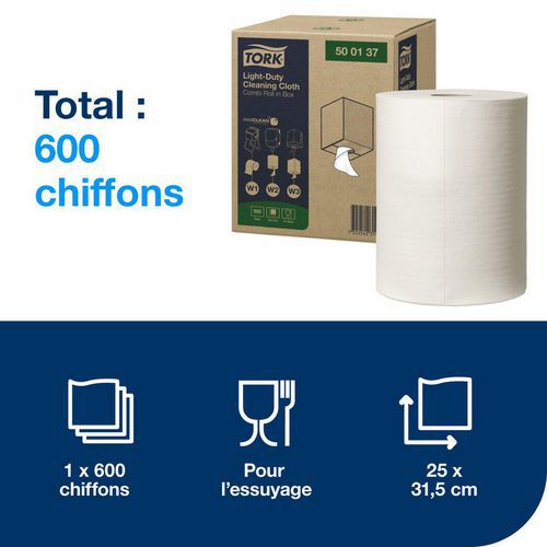 | Produktname | Kombi-Rolle mit leichten, weißen Reinigungstüchern - Tork, Farbe: Weiß, Breite Blatt: 31.5 mm |