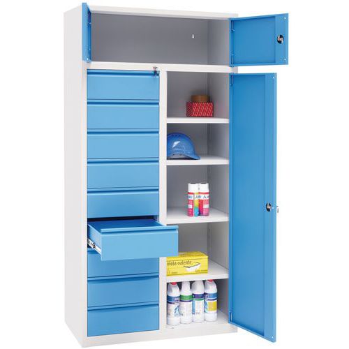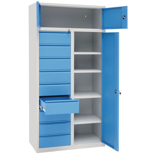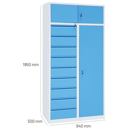 | Produktname | Kombischrank, Max. Belastung: 500 kg, Werkstoff: Stahl, Gesamthöhe: 1950 mm, Anzahl Schubladen: 9 |