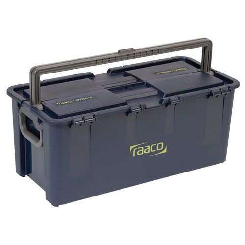 Kompakter Werkzeugkasten mit mittigen und seitlichen Tragegriffen.