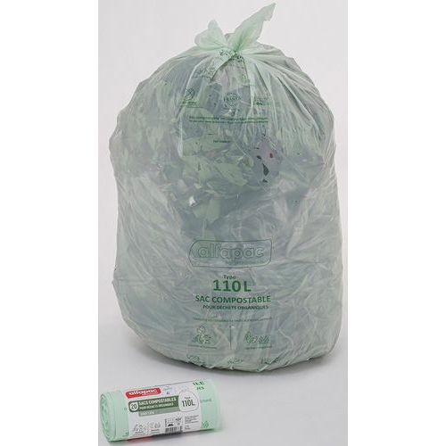 | Produktname | Kompostierbarer Müllsack für Biomüll, 110 L - Alfapac, Gesamtinhalt: 110 L, Stärke: 32 µm, Höhe: 1100 mm |