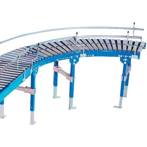 Kurvenelement für Schwerkraftförderer TRS, kombinierbar mit geradem Element. Robustes Förderergestell, epoxidbeschichtet in RAL 5017. Mit PVC-Rollen in Ø 50 mit Kugellagern, wartungsfrei. Rollen mit Federachsen, leicht austauschbar. Kundengarantie : 3 Jahre