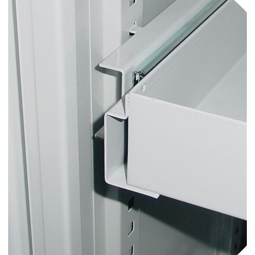Gelagerte Stoffe sind leicht zugänglich dank der auf Gleitschienen montierten Auffangfachböden/-wannen, Höhe 50 mm.