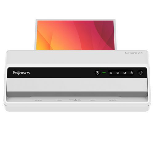 Laminiergerät Saturn 3i, bereit zum Laminieren in 60 Sekunden mit der InstaHeat-Technologie Laminiert Dokumente mit 80/100/125 Mikron und bis zu den Formaten A4 und A3 Hebel zum Lösen bei falschem Einzug oder zum Neuausrichten von Dokumenten Benachrichtigungssystem bei Reinigungsbedarf für gleichbleibend hohe Ergebnisse und optimale Laminierung Schaltet nach 30 Minuten Inaktivität in den Standby-Modus Maximale Laminiergeschwindigkeit von 50 cm/Minute