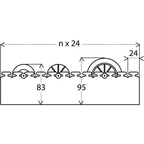 Laufrollenschiene aus Kunststoff für schwere Lasten, Länge 2400 mm. Feuerverzinkte Achse mit Dauerschmierung in glatter Hülse. Leiste mit Tragprofil, gebohrt in Abständen von 24 mm zur Befestigung. Kundengarantie : 3 Jahre Max. Belastung (kg/m²) : 600