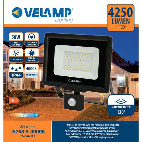 LED-Scheinwerfer 50 W mit Bewegungssensor - Velamp, Lichtstrom: 4250 lm, Energie: 50 W