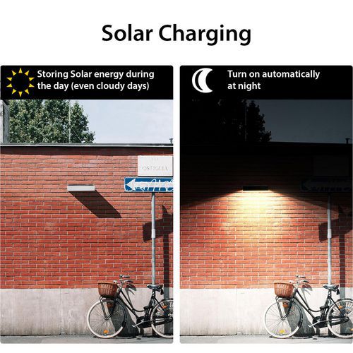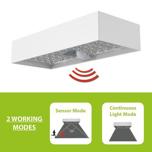 LED-Solarleuchte in Wandausführung aus Polykarbonat, UV-beständig und ABS, modernes und extrem raffiniertes Design, stoßfest und witterungsbeständig, der elektronische Teil ist besonders wasserbeständig (IP65) Funktion: Die Leuchte lädt sich tagsüber dank Sonneneinstrahlung auf 2 Betriebsmodi: 1) Die Leuchte schaltet sich nachts automatisch ein und leuchtet 5 Stunden lang mit einer Lichtleistung von 50% Dann (oder wenn die Batterieladung unter 30% sinkt) wechselt die Leuchte in den Energiesparmodus: Sie schaltet automatisch auf 100% Lichtleistung, sobald im Umkreis von ≤6 Metern eine Bewegung erfasst wird und schaltet sich dann nach 20 Sekunden ohne erfasste Bewegungen aus 2) Bewegungssensor-Modus: Die Lampe schaltet sich nachts automatisch mit 100% Lichtleistung ein, wenn im Umkreis von ≤6 Metern eine Bewegung erfasst wird. Nach 20 Sekunden ohne erfasste Aktivität reduziert sich die Lichtleistung auf 5% Die Leuchte ist mit SMD-LEDs der neuesten Generation und mit einem leistungsstarke