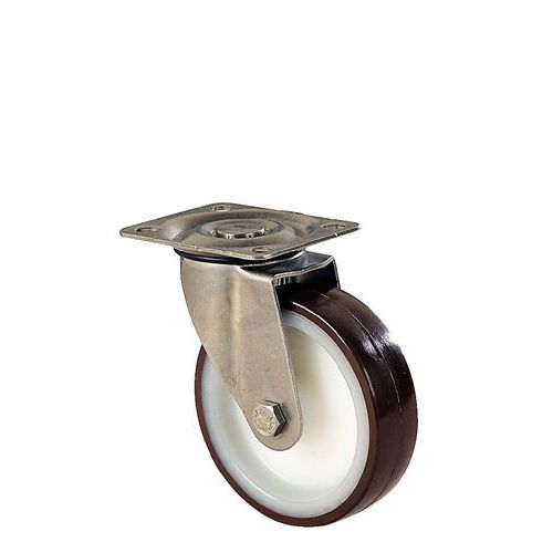 - Lenkrolle mit Gabel aus Edelstahl und einem Schwenksystem, beständig gegen diverse Säuren.