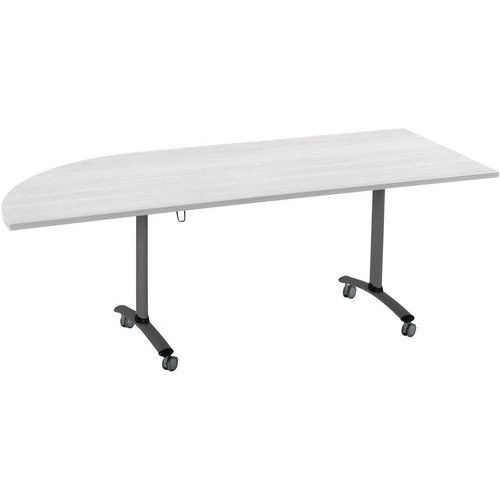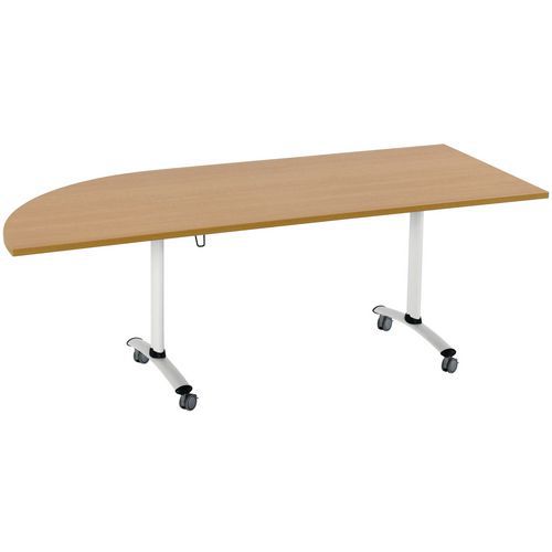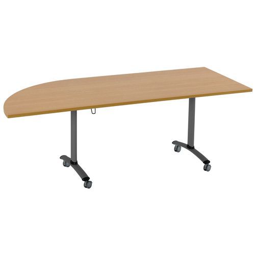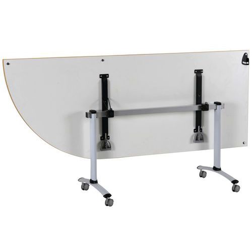 Links abgerundeter Konferenzklapptisch Axe mit hochklappbarer Tischplatte zur platzsparenden Aufbewahrung Automatische Verriegelung der Tischplatte in Arbeitsposition (horizontal) und senkrechter Position (zur Lagerung) Schnellverbindungssystem zwischen den Tischplatten über Rändelschrauben Ausgestattet mit 4 Rollen Ø 75 mm mit Bremse