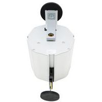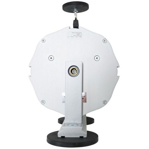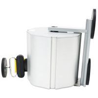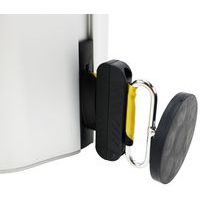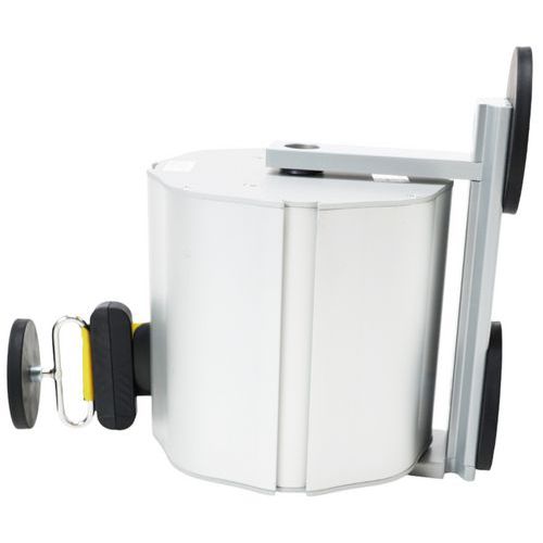 Behälter mit Gurt für magnetische Wandbefestigung. Gurtaufnahme über magnetischen Wandhalter. Ausrichtung für Absperrung in beliebiger Richtung. Integrierte Fliehkraftbremse zur Vermeidung von zu schnellem Gurtrücklauf. Gebremste Wiederaufwicklung bei versehentlichem Durchhängen.