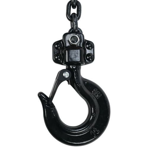 - Die schwarz lackierten, drehbaren Lasthaken aus gesenkgeschmiedetem Stahl sind mit geschweißten Sicherheitslaschen ausgestattet.