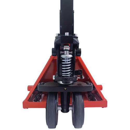 Manueller Hubwagen mit 1150 mm langen Gabeln, ideal für die Beförderung von Euronorm-Paletten mit den Maßen 1200 x 800 mm Komfortable, gummibeschichtete Deichsel mit 3 Stellungen: Heben, Neutral und Senken
