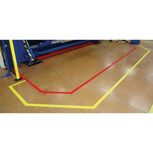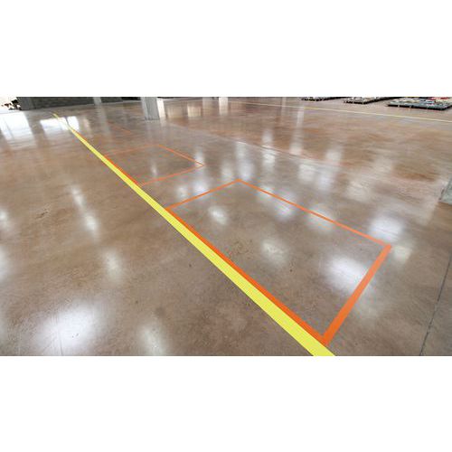 Markierungsband auf Rolle, 48 mm x 33 m 3-mal dicker (400 μm) und widerstandsfähiger als vergleichbare Produkte auf dem Markt. Steif und mit reißfestem Schutzfilm für einfaches Anbringen. Haftung auf allen Bodentypen: Sichtbeton oder eingefärbter Beton, Epoxidharz, PU-Lack usw. Alterungsbeständig, verschleißfest und widerstandsfähig gegenüber starken Belastungen durch Hubwagen, Reinigung, Feuchtigkeit sowie niedrigen bis hohen Temperaturen. Si rimuove facilmente e non lascia segni, anche dopo diversi anni.