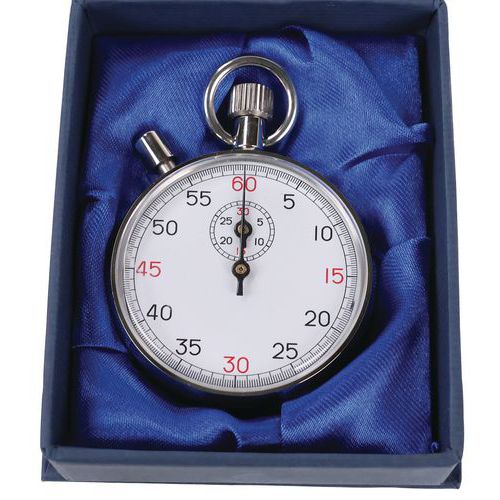 Mechanische Stoppuhr - Manutan. Ideal, um kurze oder mittelfristige Zeitintervalle zu messen. Mit einzigartigem Pendel aus Edelstahl. Ankerhemmung und Mechanik mit 13 Rubinen Reset, Start- und Stopp-Funktion.
