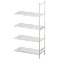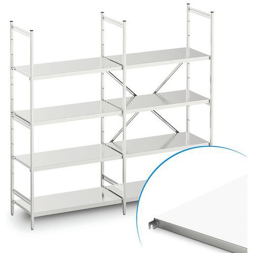 Medizinregal aus Edelstahl mit geschlossenem Regalboden aus Edelstahl Einwandfreie Hygiene: Edelstahl 18/10, 1.4301-Qualität Vollständige Abdeckung der Pfosten mit Abschlusskappe aus PVC Modulierbar: Befestigung mit Haken im Winkel von 90°, kein Ständer nötig Regal erweiterbar durch Hinzufügen eines Zusatzmoduls, sog. „Folgeelement“ Montante dotato di piedino regolabile manualmente di +/- 25 mm. Scaffalatura ideale per camere bianche, sale di sterilizzazione e sale operatorie!