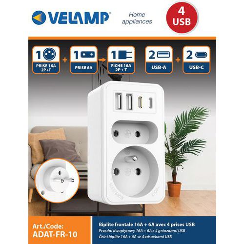 - Die Biplite von Velamp bietet Ihnen zwei elektrische Steckdosen und zusätzlich vier USB-Anschlüsse