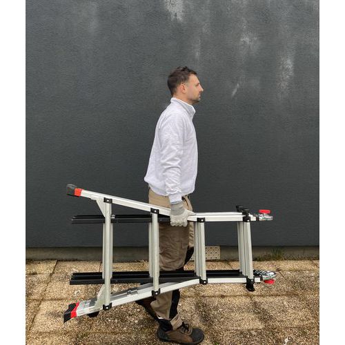 Verstellbare 4x4-Leiter mit zwei individuell verstellbaren Füßen und zwei höhenverstellbaren Böden Einfacher Transport und einfache Lagerung 2 Positionen: in ausgeklapptem Zustand oder mit zweiseitigem Aufstieg Für den professionellen, vielseitigen und einfachen Einsatz unter allen Bedingungen Verschiebbare Teleskopebenen