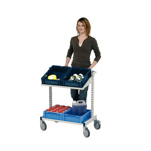Praktischer Fachboden für Ihre Euronorm-Behälter Fachboden höhenverstellbar für mehr Flexibilität Fachboden lässt sich in drei Positionen (0°, 10° oder 20°) kippen Fachboden mit Rand an allen Seiten Rollen mit Gummibereifung zum einfachen Manövrieren.