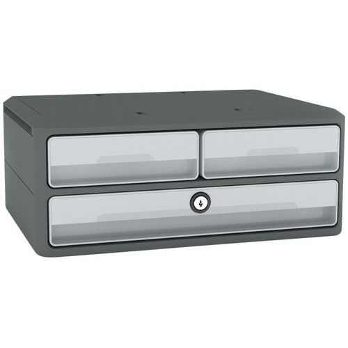 Ablagesystem MoovUp mit 2 halben Schubladen und 1 großen Schublade zur Aufbewahrung von Büromaterial sowie Dokumenten oder Tablets.