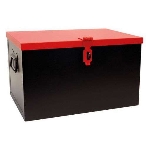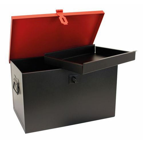 Großes Fassungsvermögen. Stahlblech für hohe Widerstandsfähigkeit. Montagebox mit verschiebbarem Fach. 2 seitliche Griffe aus Nylon für einfacheren Transport. Vorrichtung zum Abschließen mit Vorhängeschloss (Lieferung ohne Vorhängeschloss).