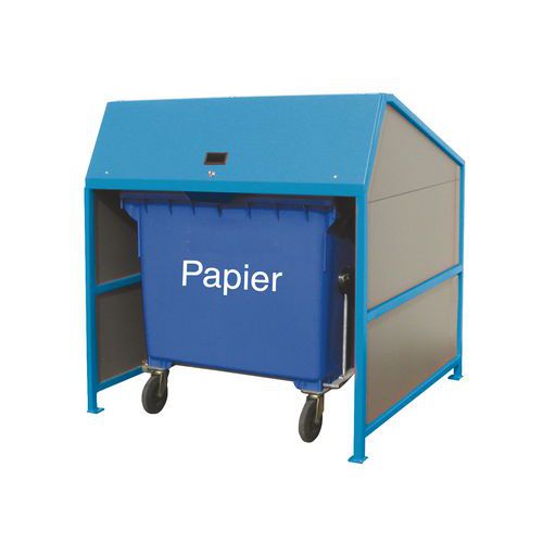 Mülltonnenbox mit Dach und drei Wänden, versehen mit einer abschließbaren Klappe mit Zylinderschloss.