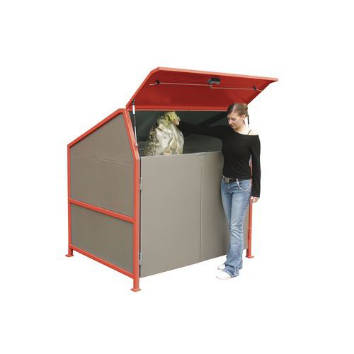 Mülltonnenbox mit Dach, drei Wänden und einer Doppel-Schwingtür.
