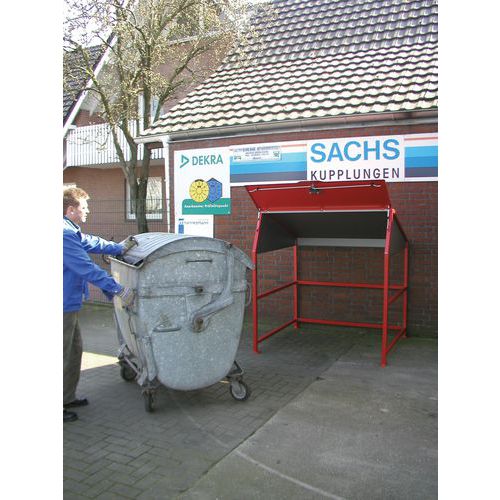 Mülltonnenbox mit Dach, Seiten offen, versehen mit einer abschließbaren Klappe mit Zylinderschloss.