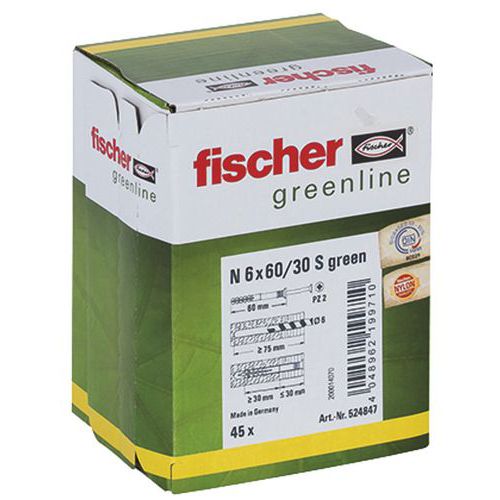 | Produktname | Nageldübel N Green 6 x 60/30 S, Steckerlänge: 60 mm, Ø: 6 mm, Werkstoff: Nylon, Typ Stütz: Holz |