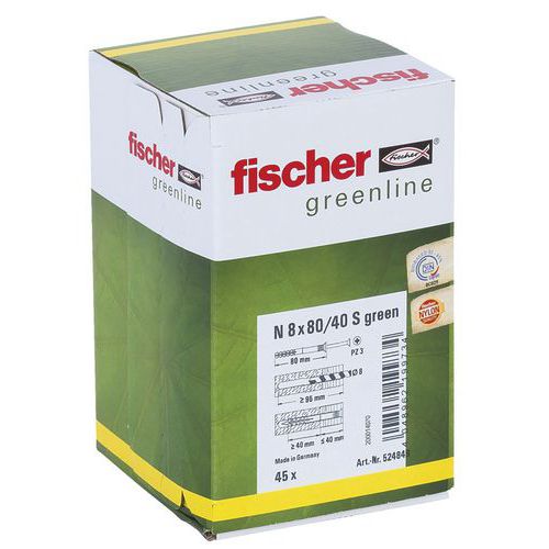 | Produktname | Nageldübel N Green 8 x 80/40 S, Steckerlänge: 80 mm, Ø: 8 mm, Werkstoff: Nylon, Typ Stütz: Holz |