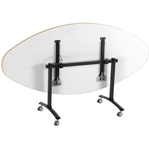 Ovaler Konferenzklapptisch Axe mit hochklappbarer Tischplatte zur platzsparenden Aufbewahrung Automatische Verriegelung der Tischplatte in Arbeitsposition (horizontal) und senkrechter Position (zur Lagerung) Schnellverbindungssystem zwischen den Tischplatten über Rändelschrauben Ausgestattet mit 4 Rollen Ø 75 mm mit Bremse