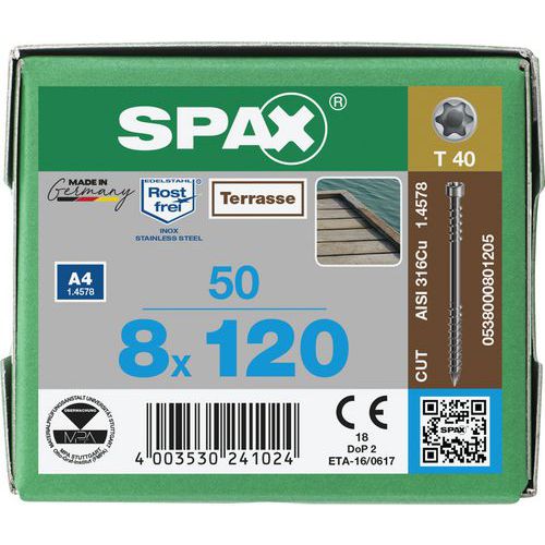 | Produktname | Packung mit 50 Terrassenschrauben mit Zylinderkopf TX Ø 8 mm – Spax, Werkstoff: Stahl, Gewinde Ø: 8 mm |