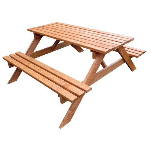 | Produktname | Picknicktische aus Holz, Werkstoff: Fichte, Gesamthöhe: 70 cm, Gewicht: 33 kg, Länge Bodenfläche: 1500 mm |