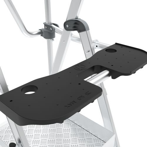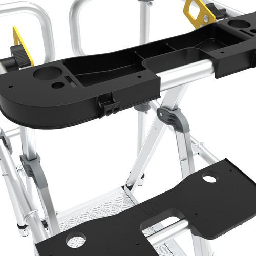 Plattform Sherpascopic Saloon Starres, 4-seitiges Geländer mit Sperre des Typs Saloon mit automatischem Verschluss Rutschfeste Stufen von 80 mm (feststehende Ebene) und von 60 mm (Teleskopebene) Abnehmbarer Werkzeughalter mit Fächereinteilung, Tragfähigkeit von 25 kg mit integrierten Haken (max. 10 kg) XL-Boden mit einer Tragfähigkeit von 25 kg Rutschfester, komfortabler Aluminiumboden, 590 x 400 mm Ergonomischer und komfortabler Arbeitsbereich Einziehbare Stabilisatoren mit millimetergenauer Einstellung Intuitives und sicheres System zur Höheneinstellung in Stufen von 23 cm Höhenverstellbare Teleskopebenen
