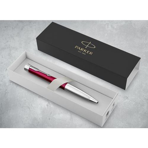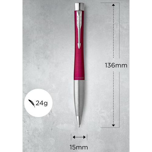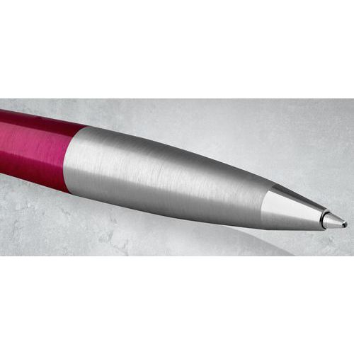 Die glänzende Lackierung in strahlendem Magenta wird ergänzt durch verchromte Zierelemente und ein Chromgehäuse sowie den für Parker typischen pfeilförmigen Clip