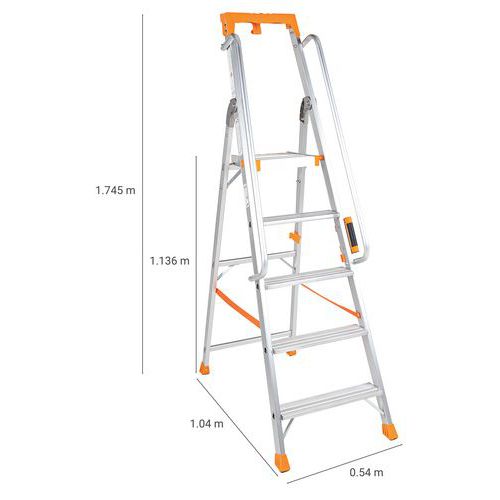 Profitrittleiter aus Aluminium. Multifunktions-werkzeugträgerfach. Bequem und sicher dank rampe. Verstärkte Aluminiumprofile. Plattform mit Verriegelungssystem. Rutschfeste Sprossen. Einfach zu transportieren und zu lagern Kundengarantie : 10 Jahre Max. Belastung (kg) : 150 kg
