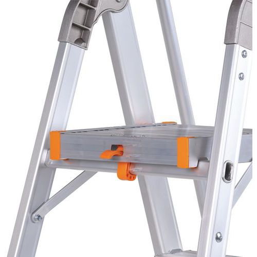 Profitrittleiter aus Aluminium. Multifunktions-werkzeugträgerfach. Bequem und sicher dank rampe. Verstärkte Aluminiumprofile. Plattform mit Verriegelungssystem. Rutschfeste Sprossen. Einfach zu transportieren und zu lagern