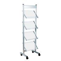 Prospektständer mit Stahlrahmen. Mit 4 Lenkdoppelrollen mit Feststeller. Fachboden aus hochwertigem Acrylglas.