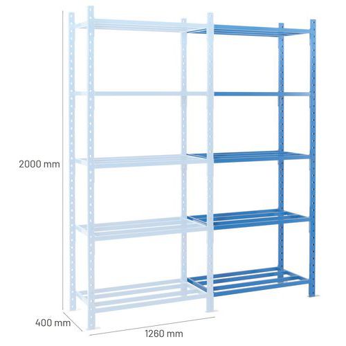 Sehr stabiles Regal mit einer verbesserten Tragkraft (bis zu 2,5 t). Rohrfachboden für ausgezeichnete Belüftung der Waren und einfache Wartung. Einfach erweiterbar mit einem oder mehreren Folgeelementen